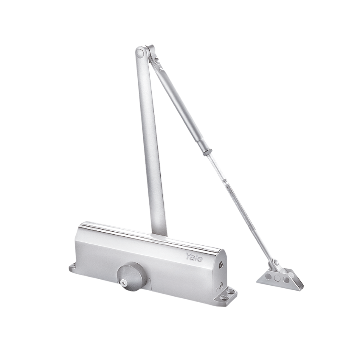 - Cuenta con tres válvulas: dos para control de velocidad de cierre inicial y final, y una para control de apertura, ajustando el freno hidráulico.